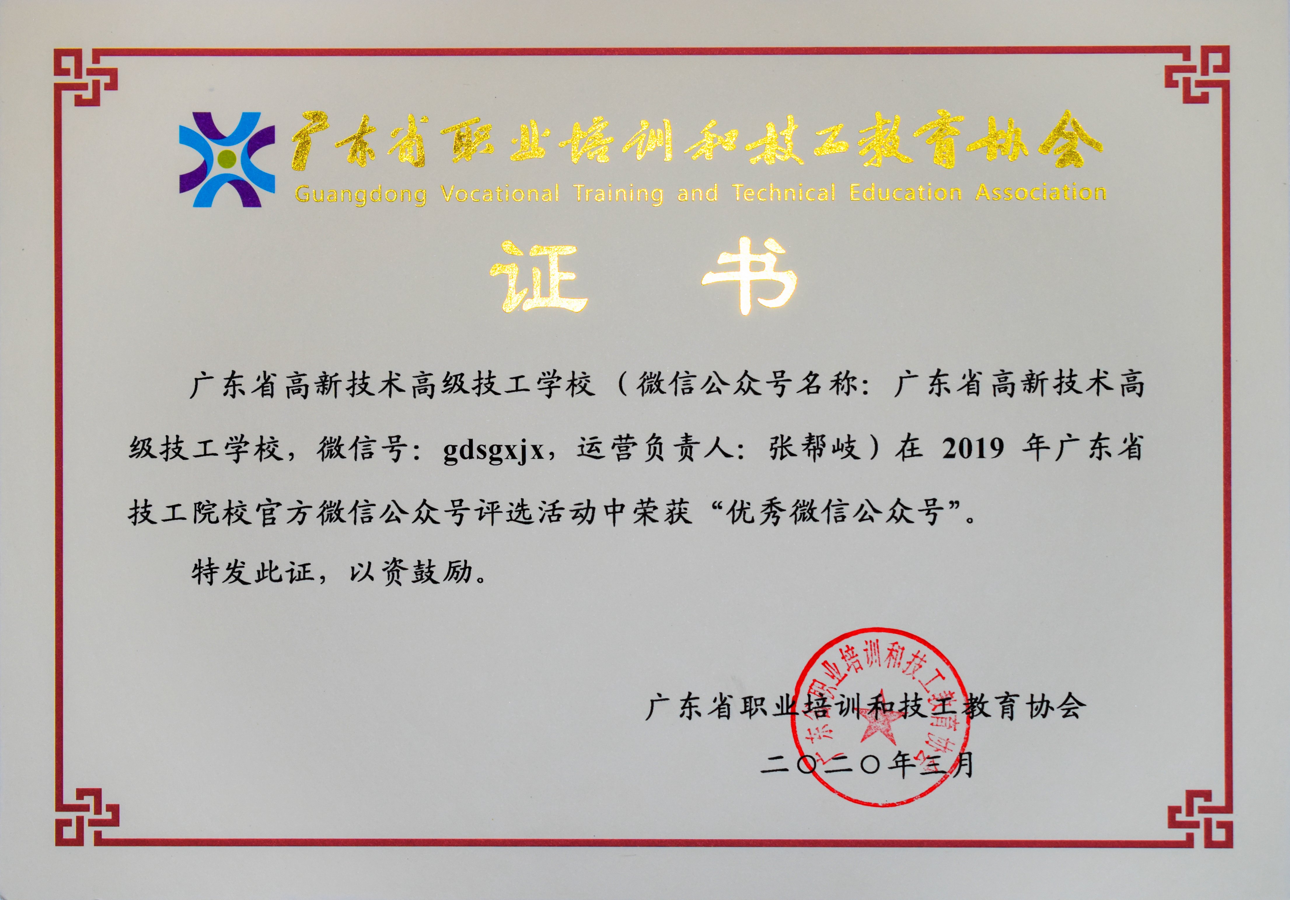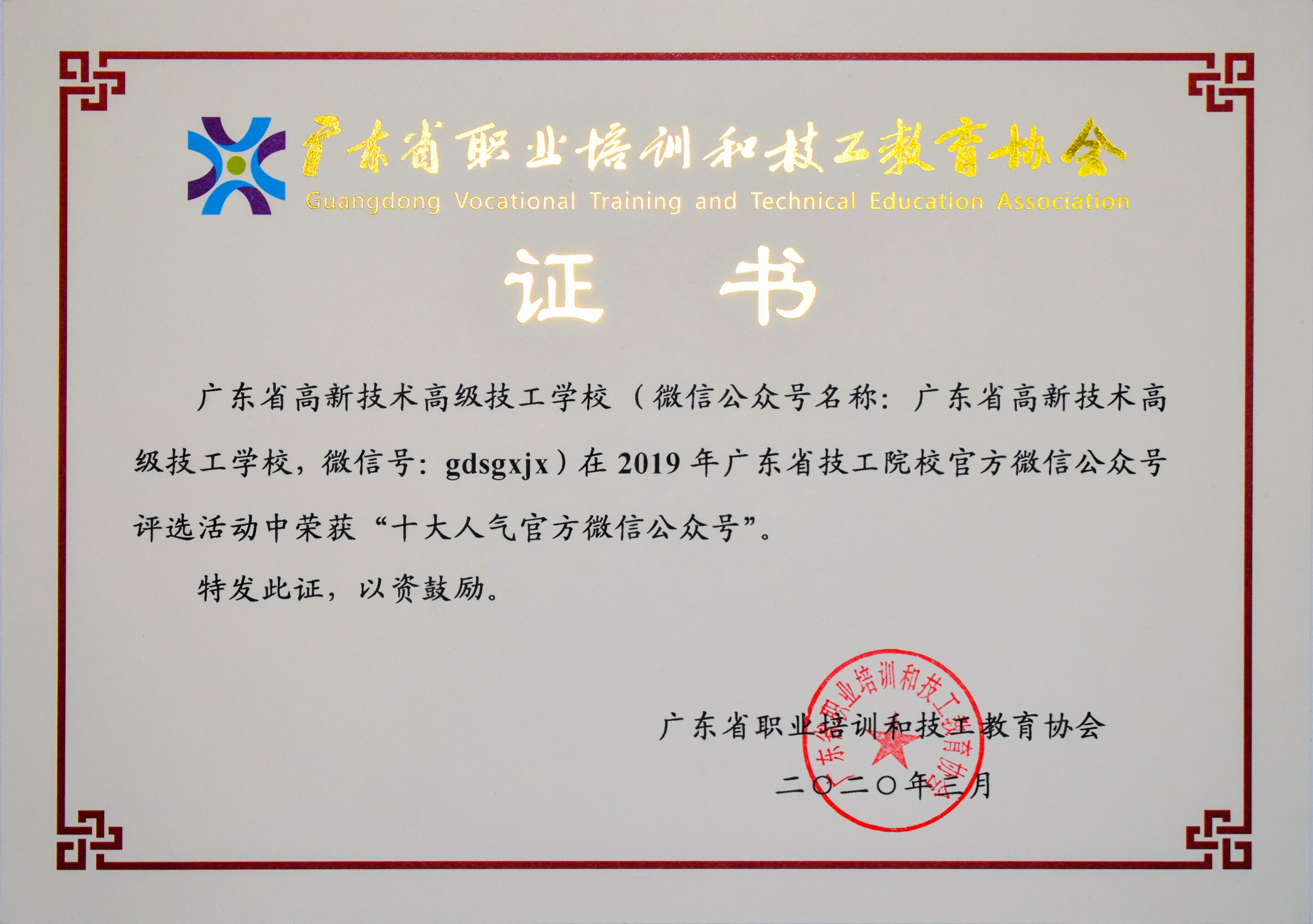 2020年3月:我校微信公眾號榮獲“2019年廣東省技工院校微信公眾號及校報校刊評選”年度十大人氣官方微信公眾號