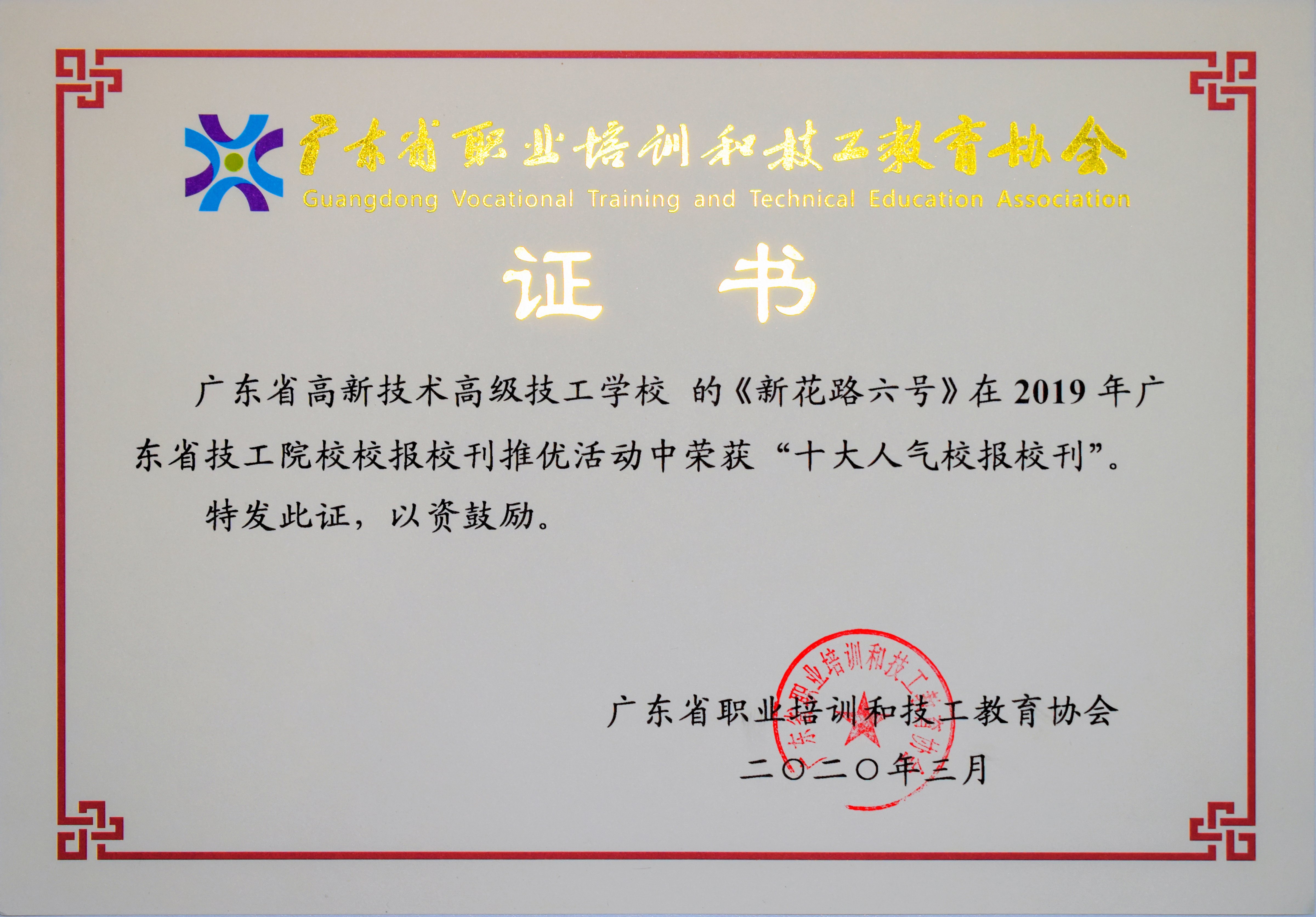 2020年3月:我校校刊《新華路六號》榮獲“2019年廣東省技工院校校報校刊評選”優十大人氣校報校刊