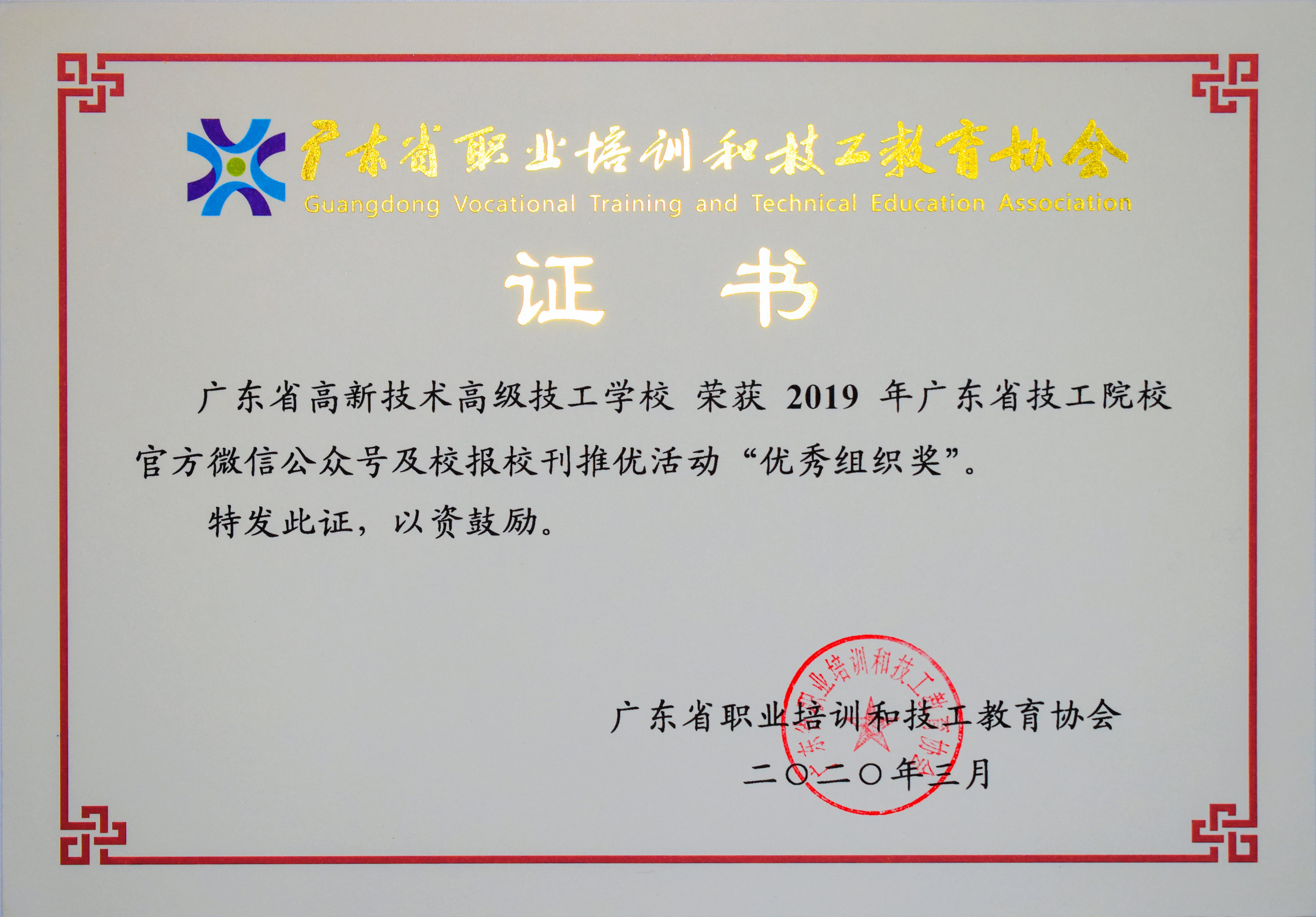 2020年3月:我校榮獲“2019年廣東省技工院校微信公眾號及校報校刊評選”優秀組織獎