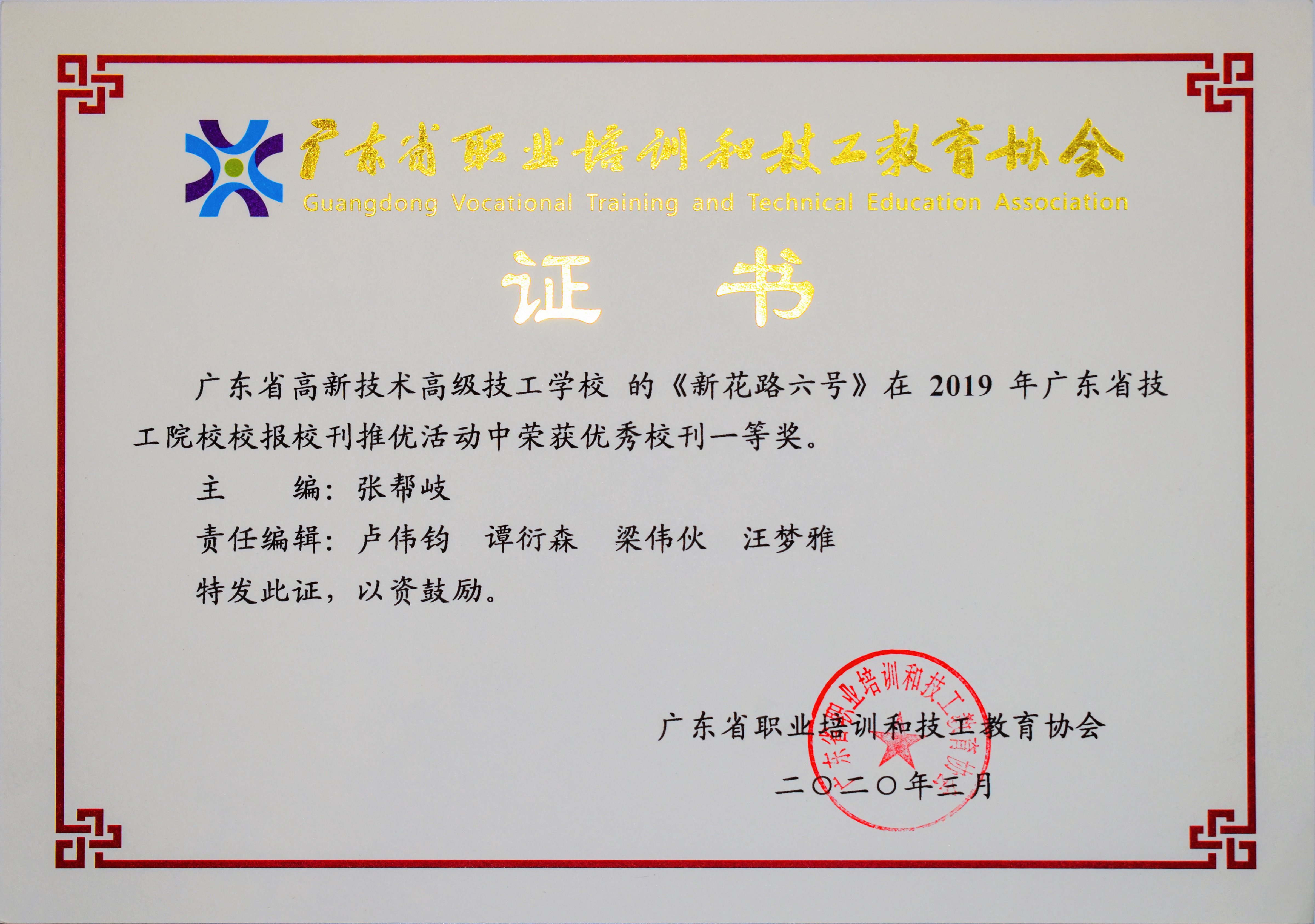 2020年3月:我校校刊《新華路六號》榮獲“2019年廣東省技工院校校報校刊評選”優秀校刊一等獎