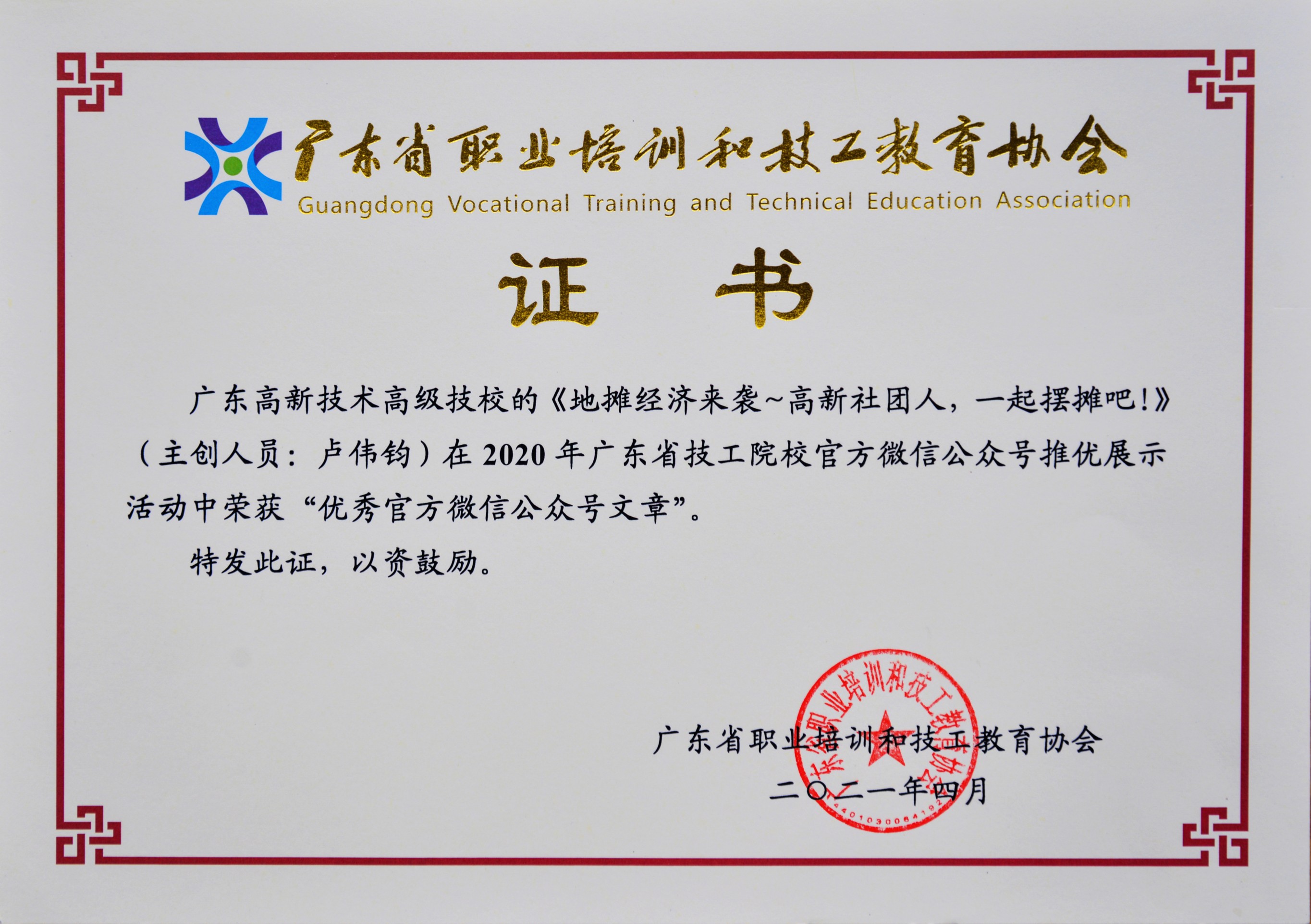? ? ? ? ? ? ? ? ?文章《地(di)攤經(jing)濟來襲~高新(xin)社(she)團人(ren),一(yi)起擺攤吧~》榮獲“2020年(nian)度廣東(dong)省技(ji)工院(yuan)校(xiao)微信公(gong)眾號(hao)評選”優秀官方微信公(gong)眾號(hao)文章獎。
