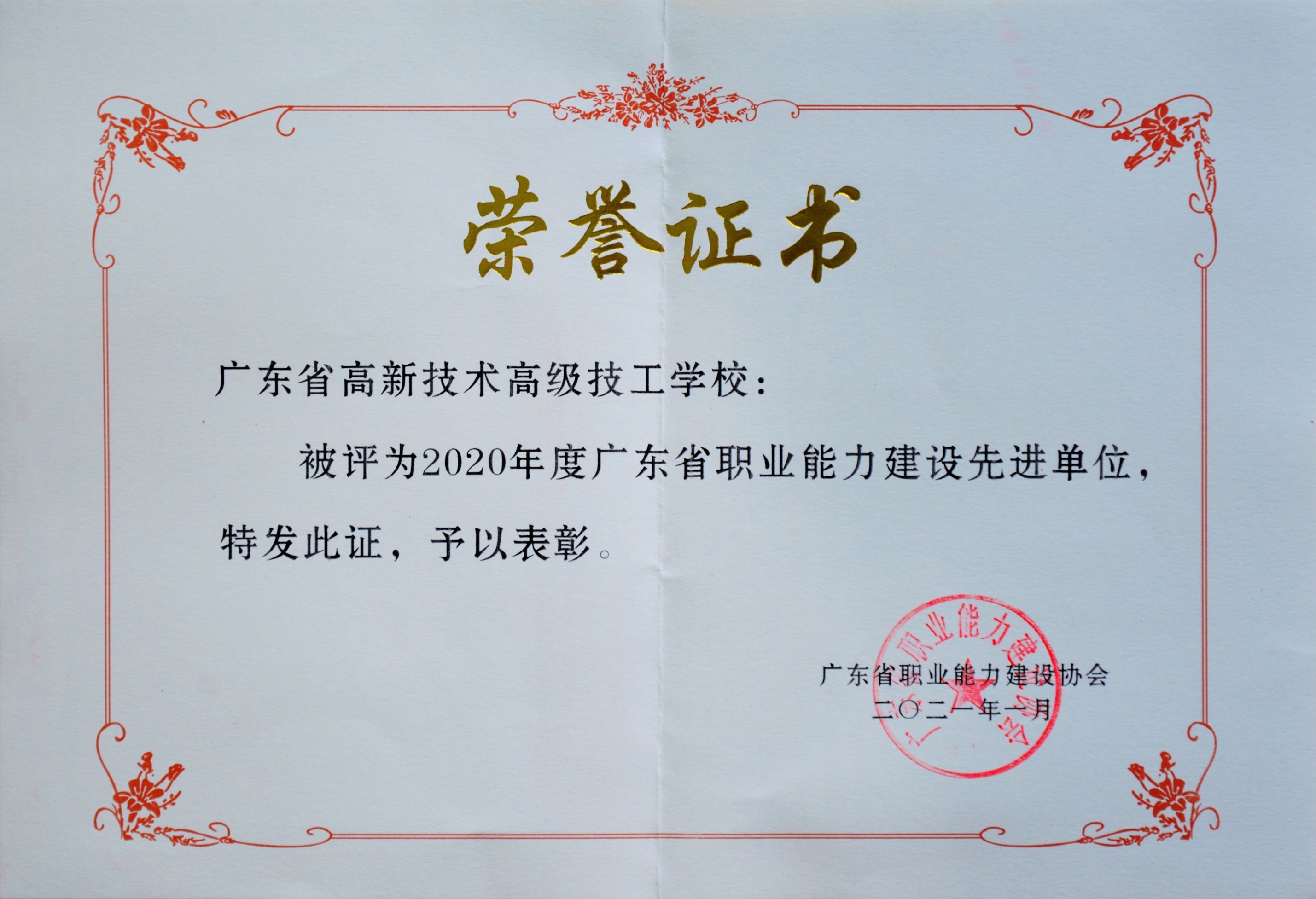 2021年1月:我校被評為2020年度廣東省職業能力建設先進單位