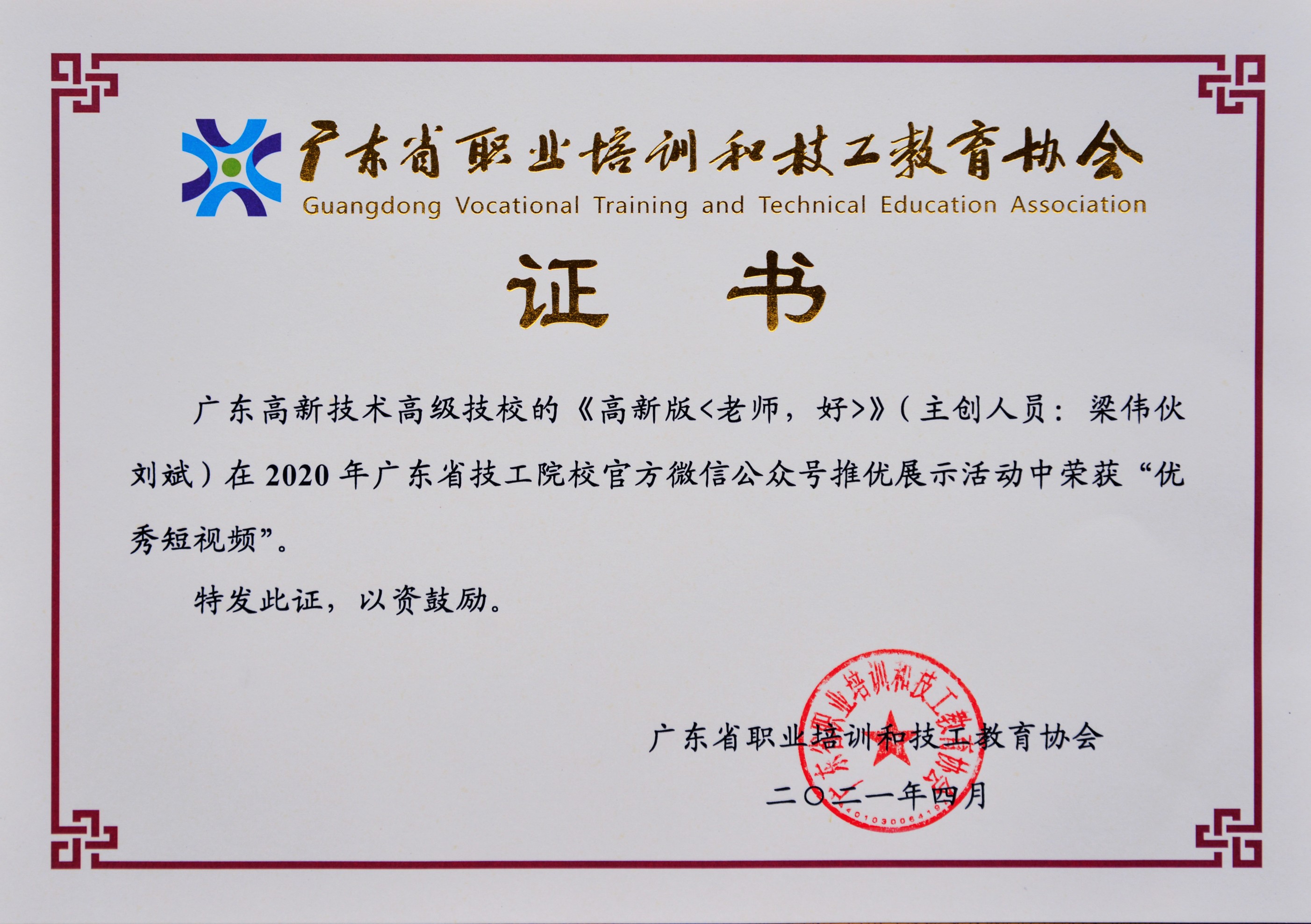 ? ? ? ? ? ? ? ? 《老師·好》微(wei)電影作品榮獲(huo)“2020年度廣東省技工(gong)院(yuan)校微(wei)信公(gong)眾(zhong)號評選”優秀短視頻獎;?