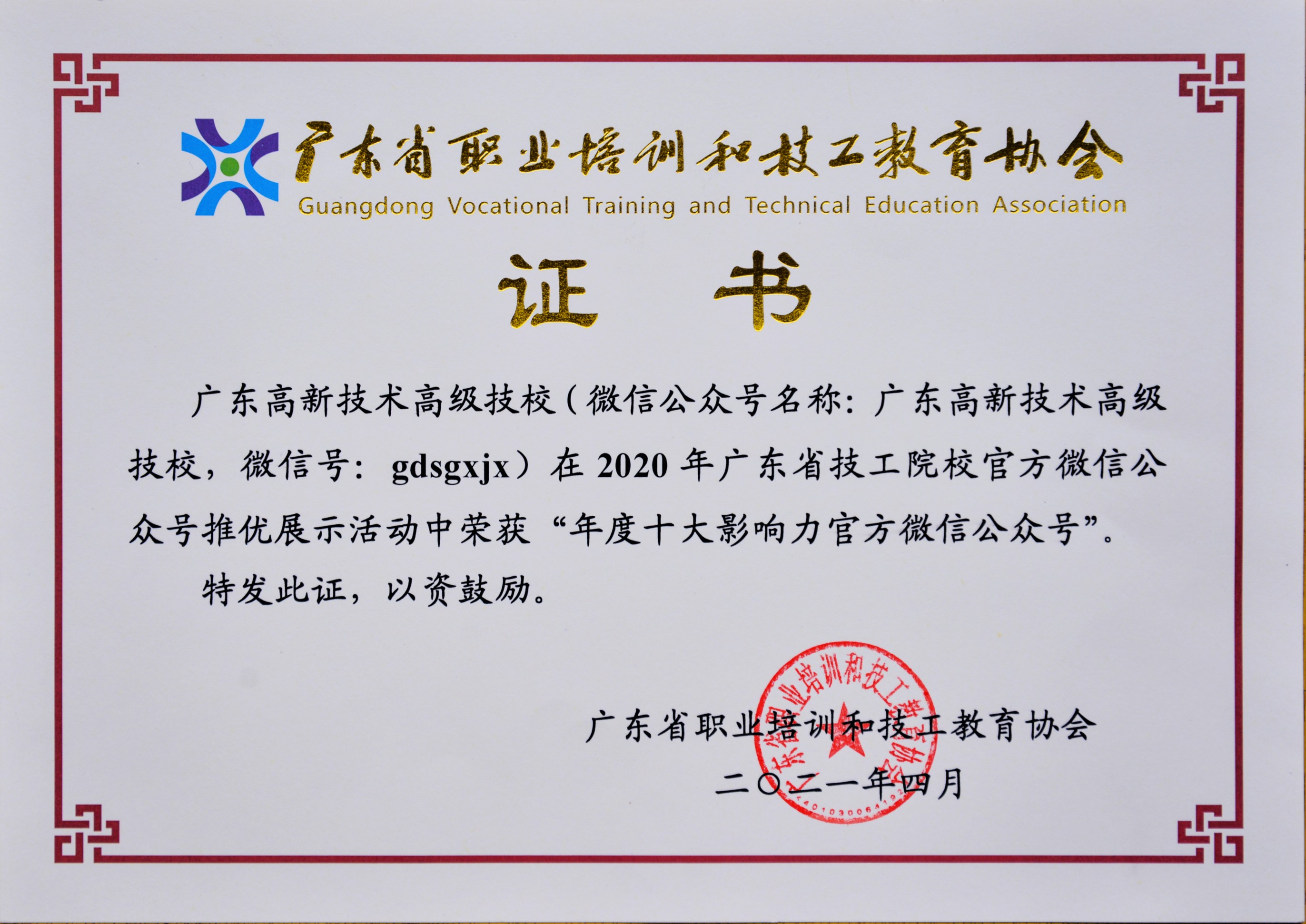 2021年4月15日:我校(xiao)(xiao)微信(xin)公眾號(hao)榮獲“2020年度(du)廣東省技工院校(xiao)(xiao)微信(xin)公眾號(hao)評選”年度(du)十(shi)大影響力官方微信(xin)公眾號(hao)獎;
