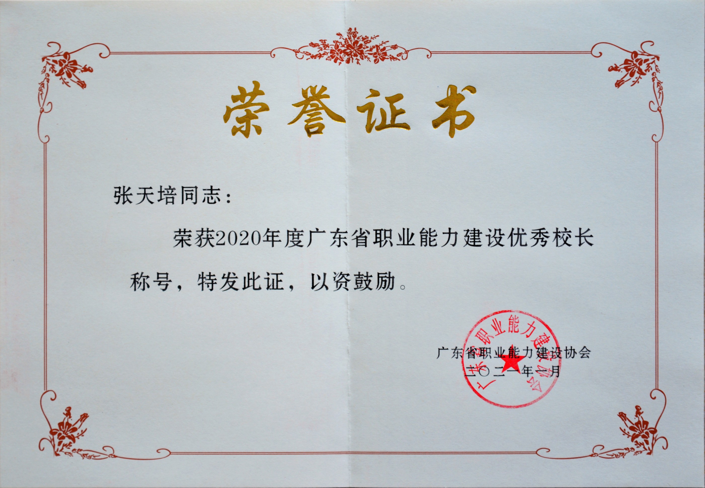2021年1月:我校(xiao)張天(tian)培校(xiao)長(chang)榮獲(huo)2020年度廣(guang)東省職業(ye)能力建設優秀院(yuan)校(xiao)長(chang)稱號