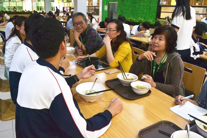 中午(wu)12點左右,同學們陸(lu)續下課走進食(shi)堂吃飯(fan)。執行(xing)校長肖中圓、副校長文(wen)建友(you)以及幾位校領導排著隊(dui),拿著餐(can)盤在食(shi)堂窗口排隊(dui)打飯(fan),打完飯(fan)走到(dao)空座位上與幾位同學邊(bian)吃邊(bian)聊了(le)起來。