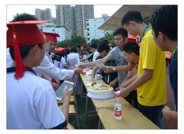 ?? ?儀式結束后,參加(jia)成人禮的同學們在各自系里準備的青(qing)春標語橫幅上簽上自己的名字,然后圍在一(yi)起品嘗學校為他們送上小豬(zhu)佩(pei)奇“社會(hui)人”蛋糕。