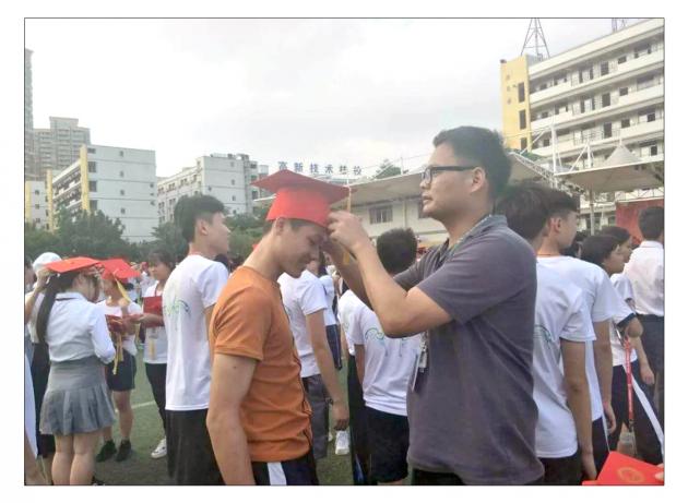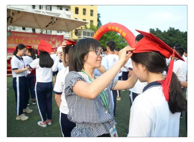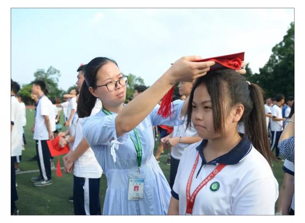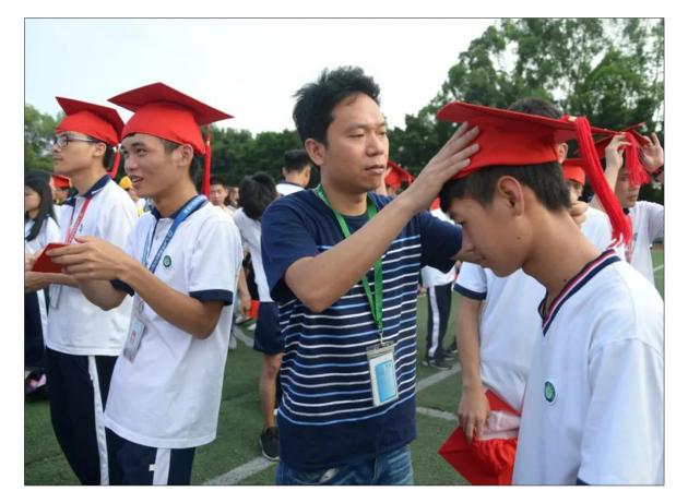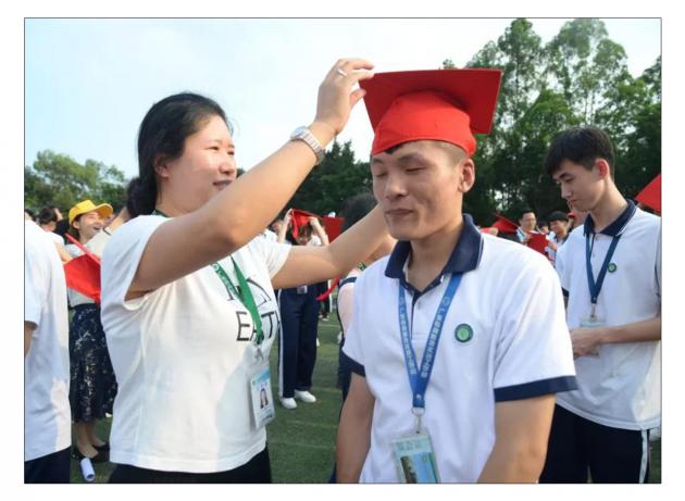 ? ?老師、家長為青年(nian)們佩(pei)戴成人帽,頒發(fa)成人證書。