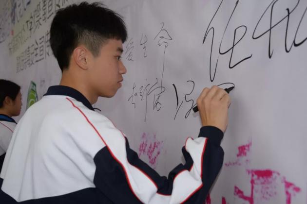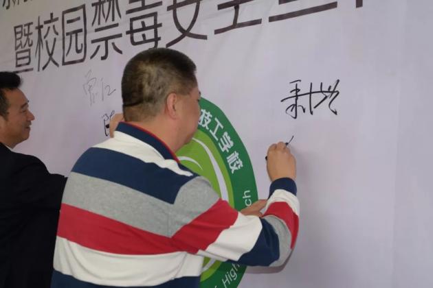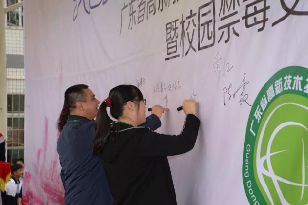 ? ??最后,舉行簽名儀式,領導嘉賓和各班級代(dai)表在背景板上簽上名字。