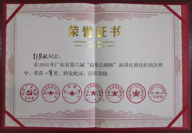 ? ? ? 其中,比賽評委廣東演講學會常務副會長劉雪庚老師在賽后點評中,贊揚郭慧敏同學把演講主題與個人感受結合,把紅色基因與工匠精神兩者結合,鼓勵技工院校學生成為復合型人才,為強軍強國作貢獻。